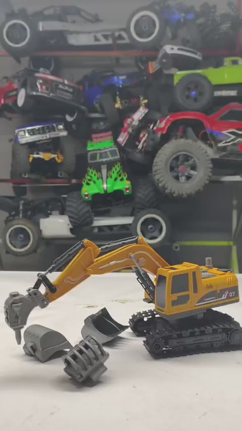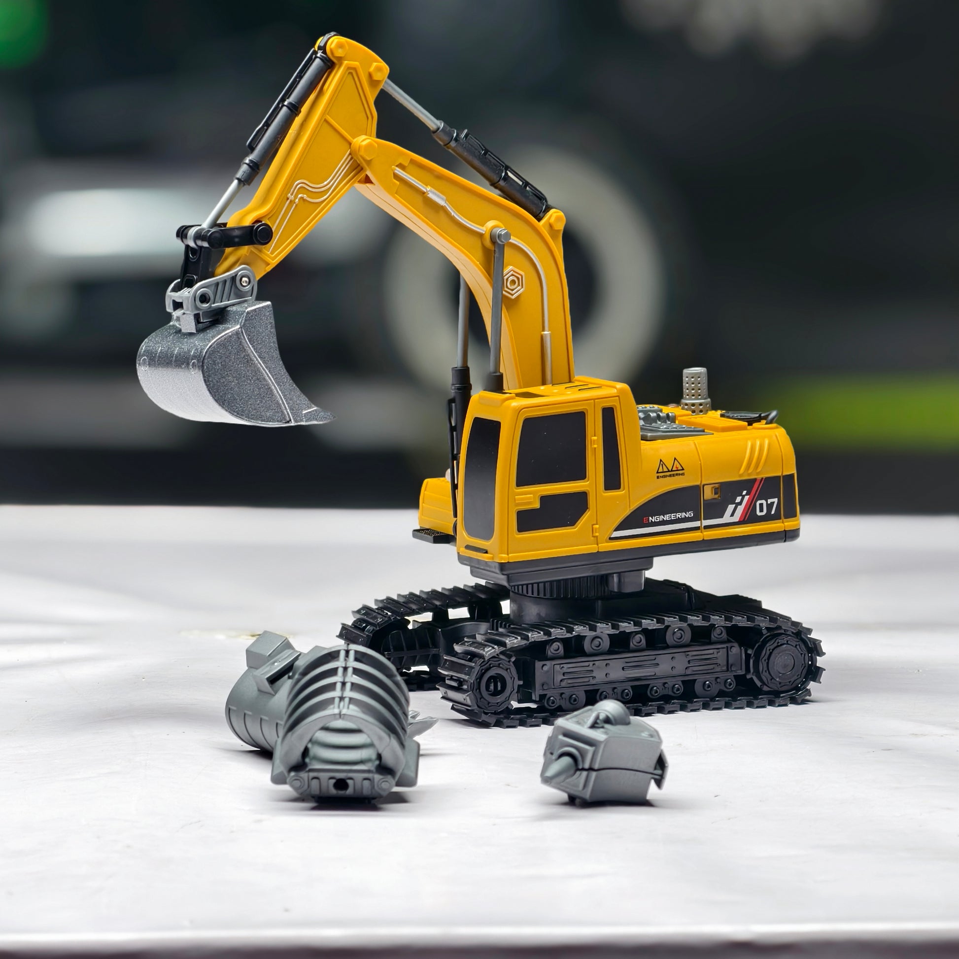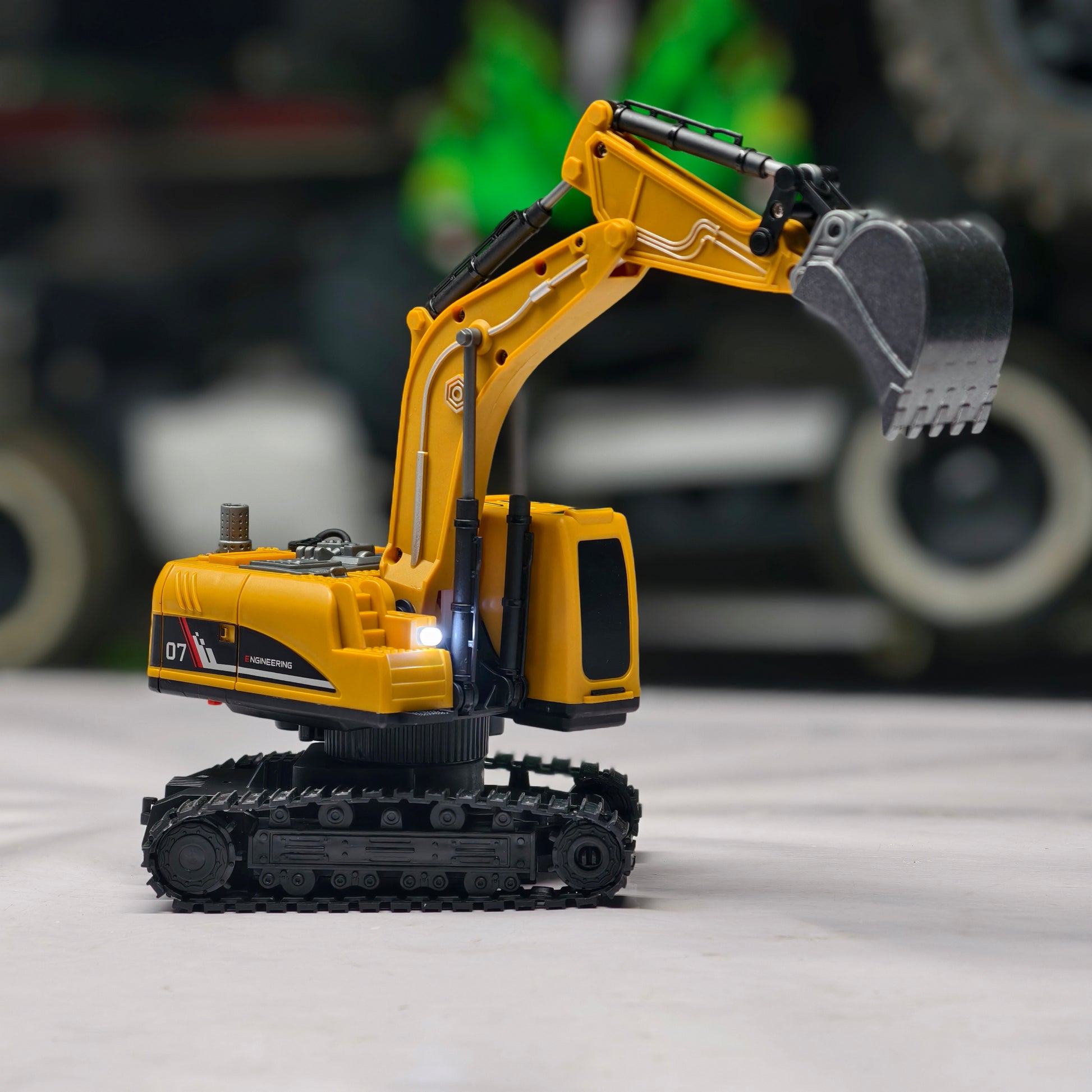Features include 360° rotation of the cab, realistic lights and sounds, and a durable alloy bucket for digging,