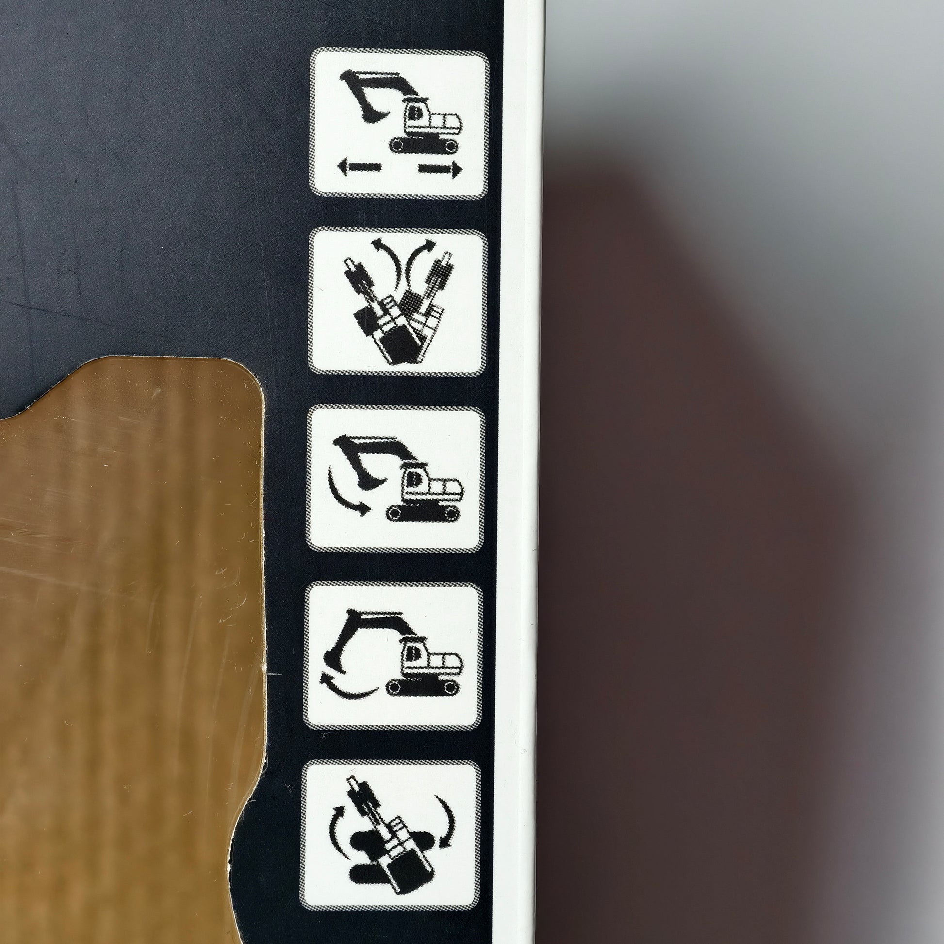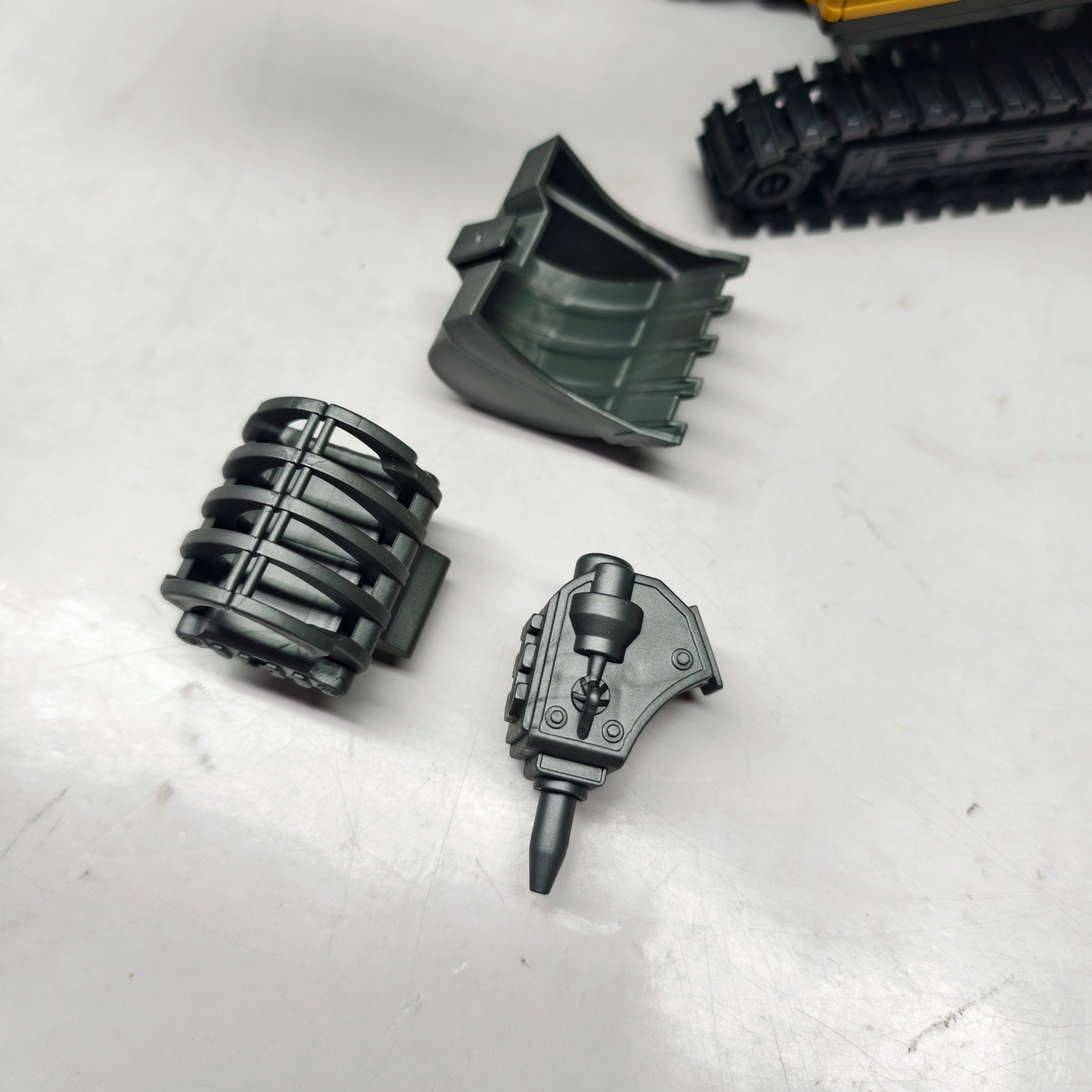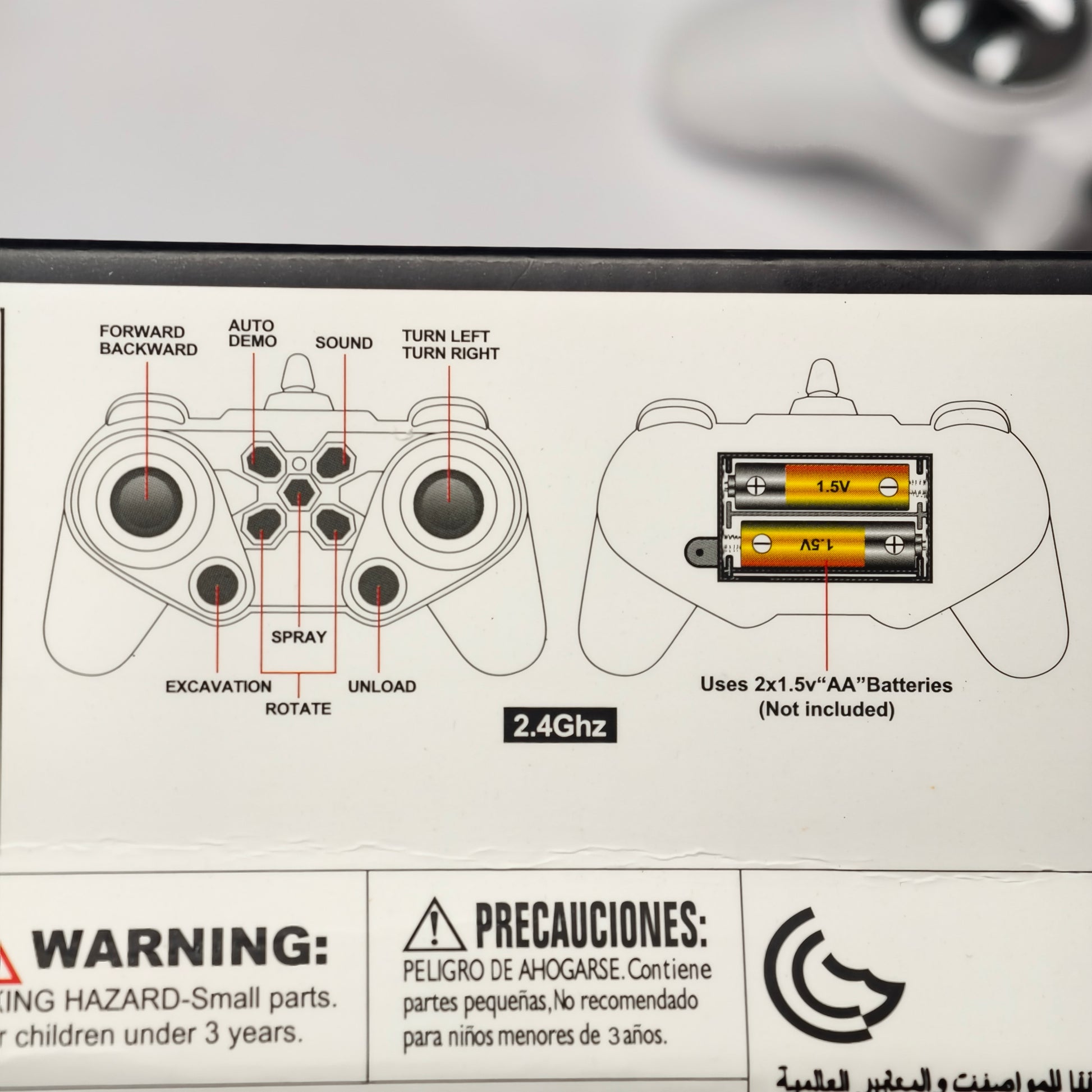 Features include 360° rotation of the cab, realistic lights and sounds, and a durable alloy bucket for digging,