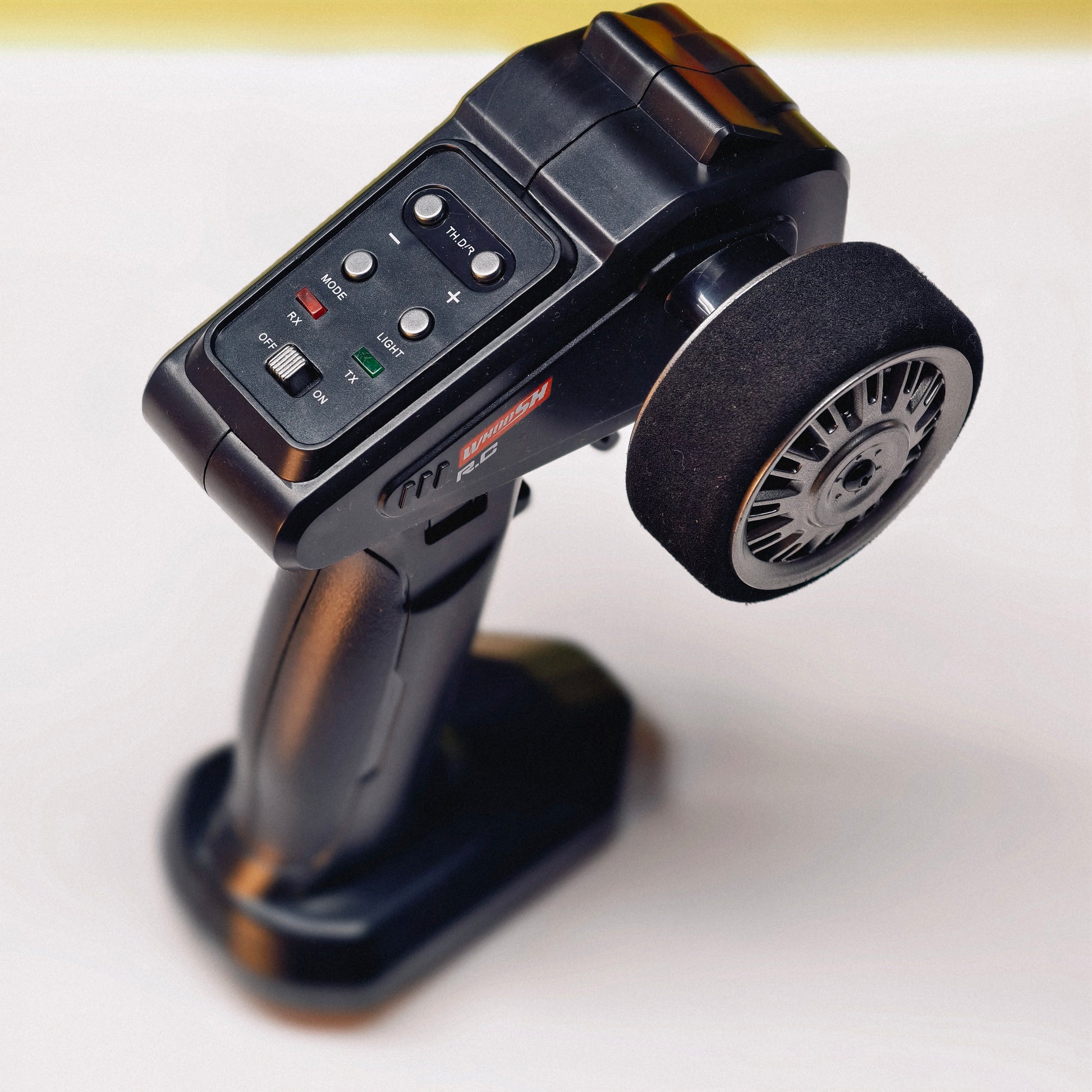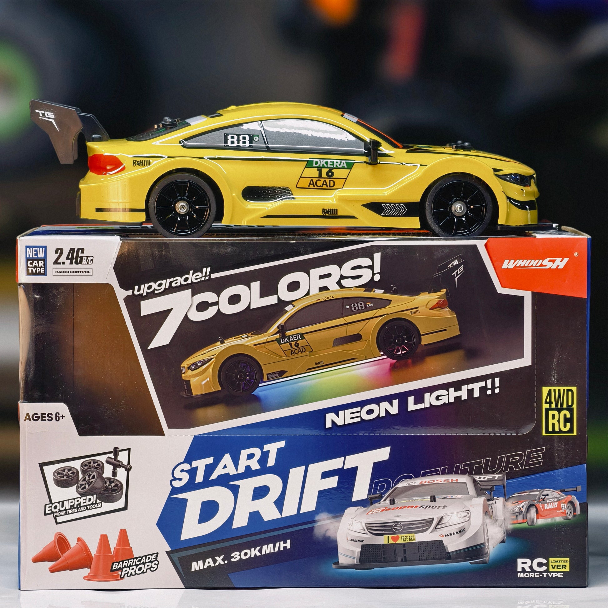 This product is a WHOOSH 1:16 Scale RC Drift Car featuring a retro-inspired design and modern functionalities.